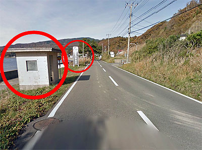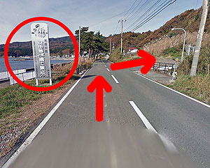 | このコンクリートのバス停と看板が見えたらまもなく右折です! | ![]() |